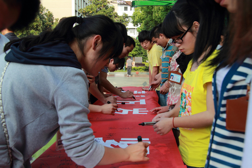 活动最后,所有在场的团员青年在“青春万岁,紧跟党走”的红色横幅上签名。