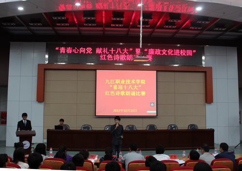 九江职院新闻网讯(校学生会 廖英英)10月25日,由校团委、学工处、纪监办联合主办,校学生会学习部承办的“青春心向党,献礼十八大”红色诗歌朗诵大赛在4号学术厅举行,来自学工处、团委、纪监办、组织部、宣传部、图书馆的7位老师受邀担任评委。