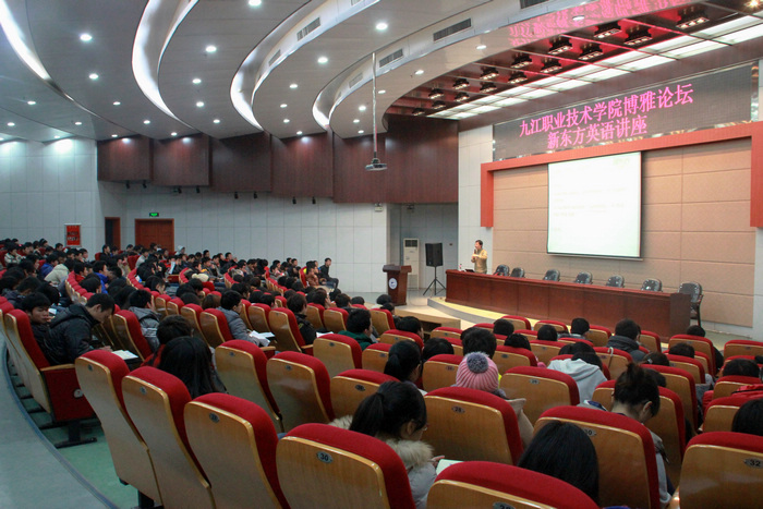 九江职院新闻网讯(学工处 团委)12月25日晚,我校博雅论坛之新东方英语专题讲座在4号教学楼学术厅举行。此次讲座由具有多年教学经验的南昌新东方任瑞罡、唐迟两位老师主讲,学校英语类协会的同学以及众多的外语爱好者近400人参加讲座。